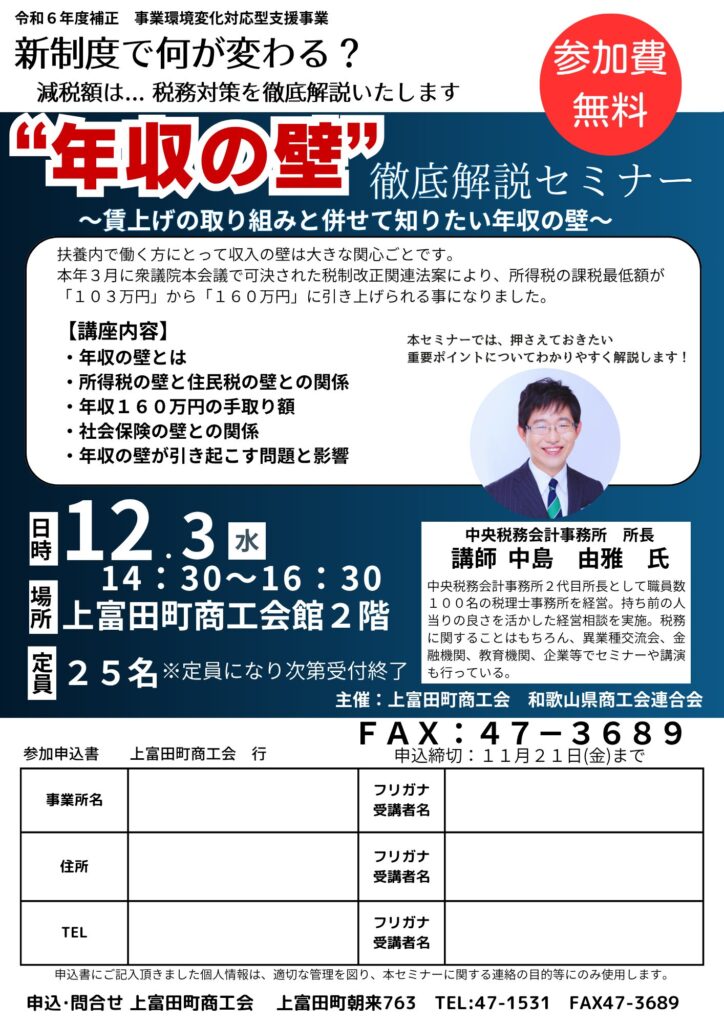 “年収の壁”徹底解説セミナーのお知らせ 2025年11月18日 セミナ-情報 令和7年から所得税の課税最低額が「103万円」から「160万円」に引き上げられることになりました。 上富田町商工会では、年末調整事務の準備をおこなっている事業所の皆様にわかりやすく解説するセミナーを開催いたします。