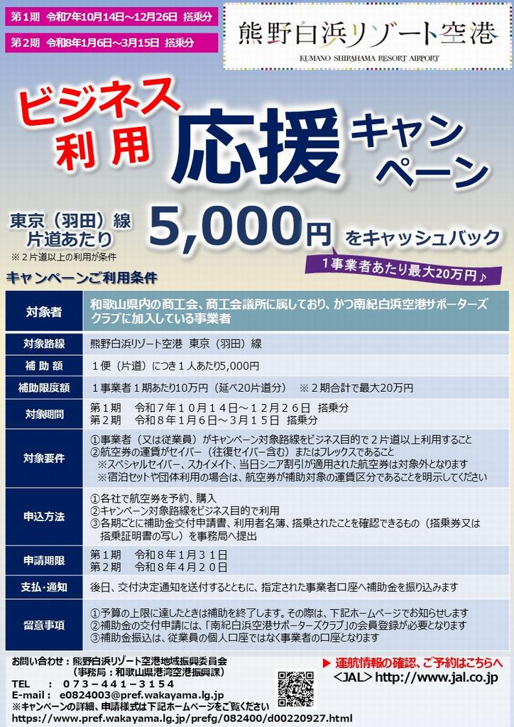 和歌山県では、商工会商工会議所の会員事業所を対象に、下記チラシのとおり利用促進キャンペーンを実施します。